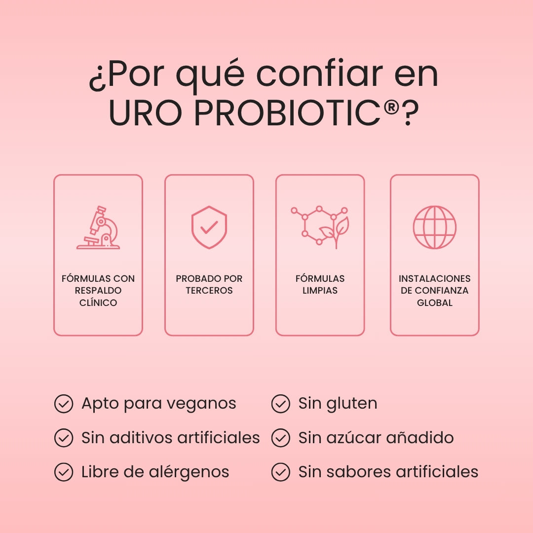 Ya sea que estés luchando contra desequilibrios del pH vaginal, recuperándote de infecciones por hongos o simplemente quieras cuidar tu salud íntima de manera más inteligente, URO PROBIOTIC® le brinda a tu cuerpo lo que necesita para mantenerse equilibrado, protegido y saludable, de adentro hacia afuera.